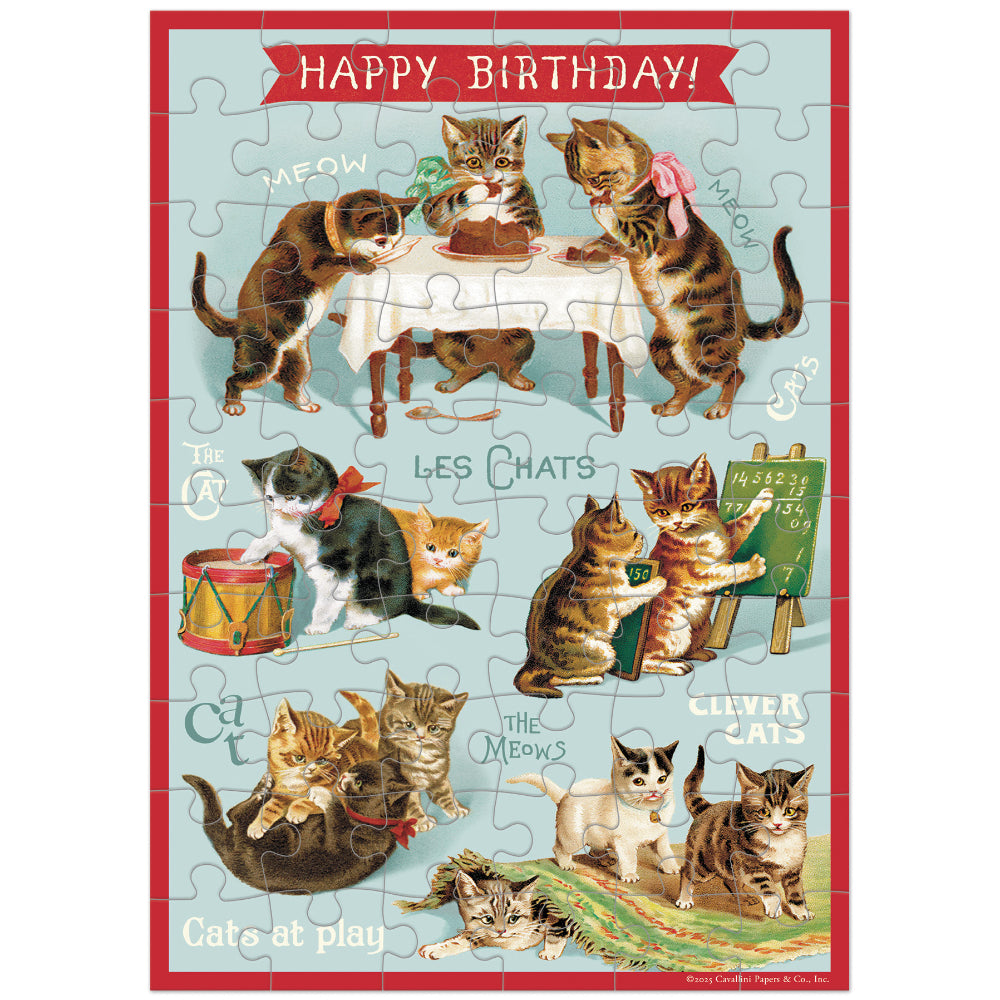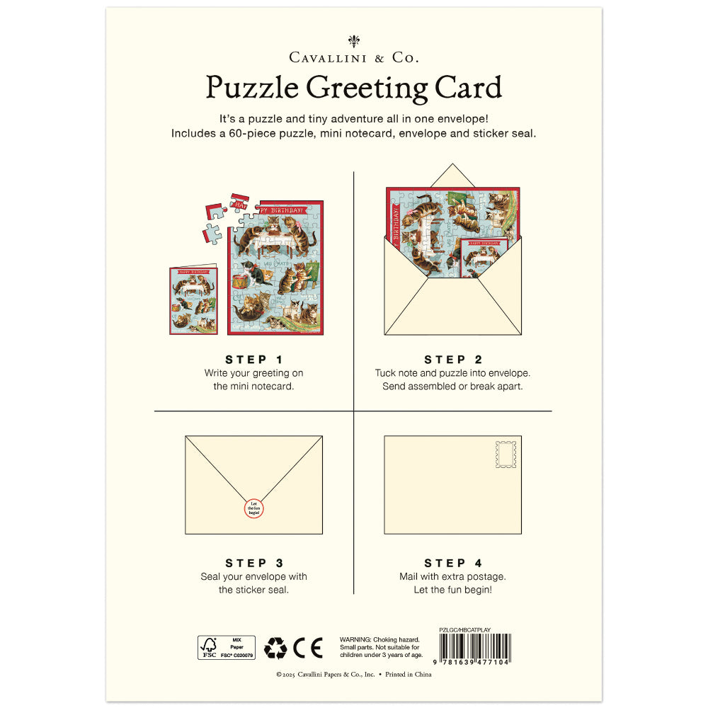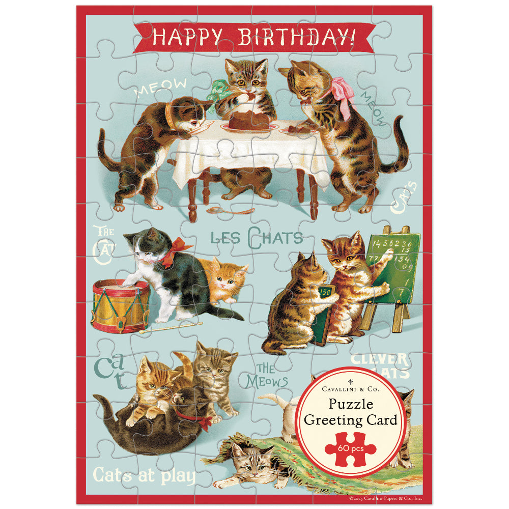 Delight the cat lover in your life with the Cavallini Puzzle Greeting Card – Cats Play (60 Pieces). Featuring charming vintage kitten illustrations from the Cavallini archives, this playful design shows mischievous cats celebrating, drumming, studying and, of course, enjoying birthday cake beneath a cheerful “Happy Birthday!” banner.